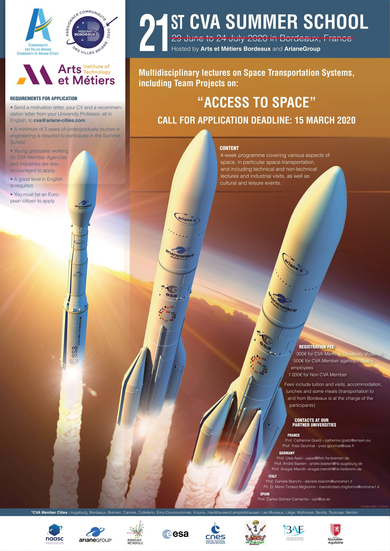 La 21ème école d’été de la Communauté des Villes Ariane aura lieu du 28 juin au 23 juillet 2021 [REPORTÉ] en Nouvelle-Aquitaine, principalement à Bordeaux, avec le soutien de Bordeaux Métropole, d’ArianeGroup Bordeaux, d’Arts et Métiers Bordeaux-Talence et du NAASC.