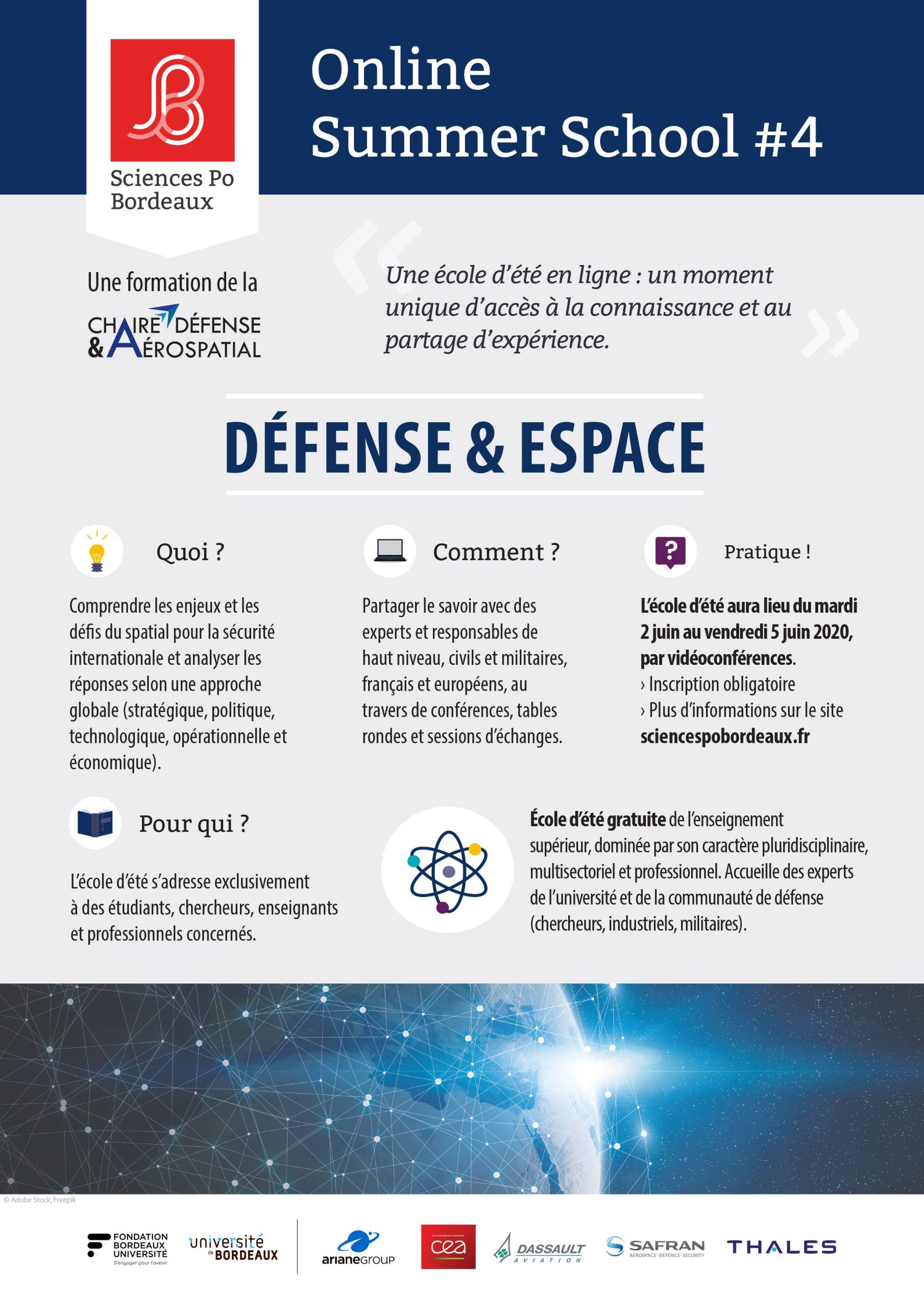 L’école d’été Bordeaux Defence & Space Online Summer School 2020 a eu lieu du 2 au 5 juin 2020. Créée par la chaire « Défense & Aérospatial » à Sciences Po Bordeaux, elle se réunit chaque année depuis 2016. Adoptant une approche globale et pluridisciplinaire, elle entend partager la connaissance sur la place du spatial dans la sécurité internationale et éveiller ses auditrices et auditeurs aux enjeux et défis que ce nouveau champ d’affrontement pourrait constituer au XXIe siècle.